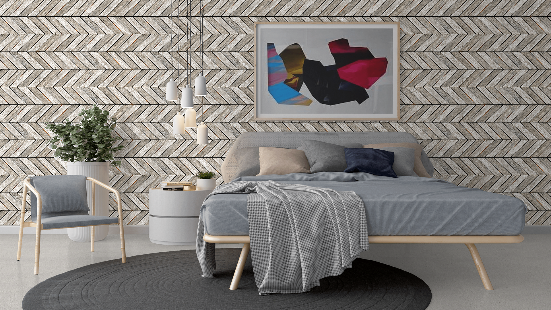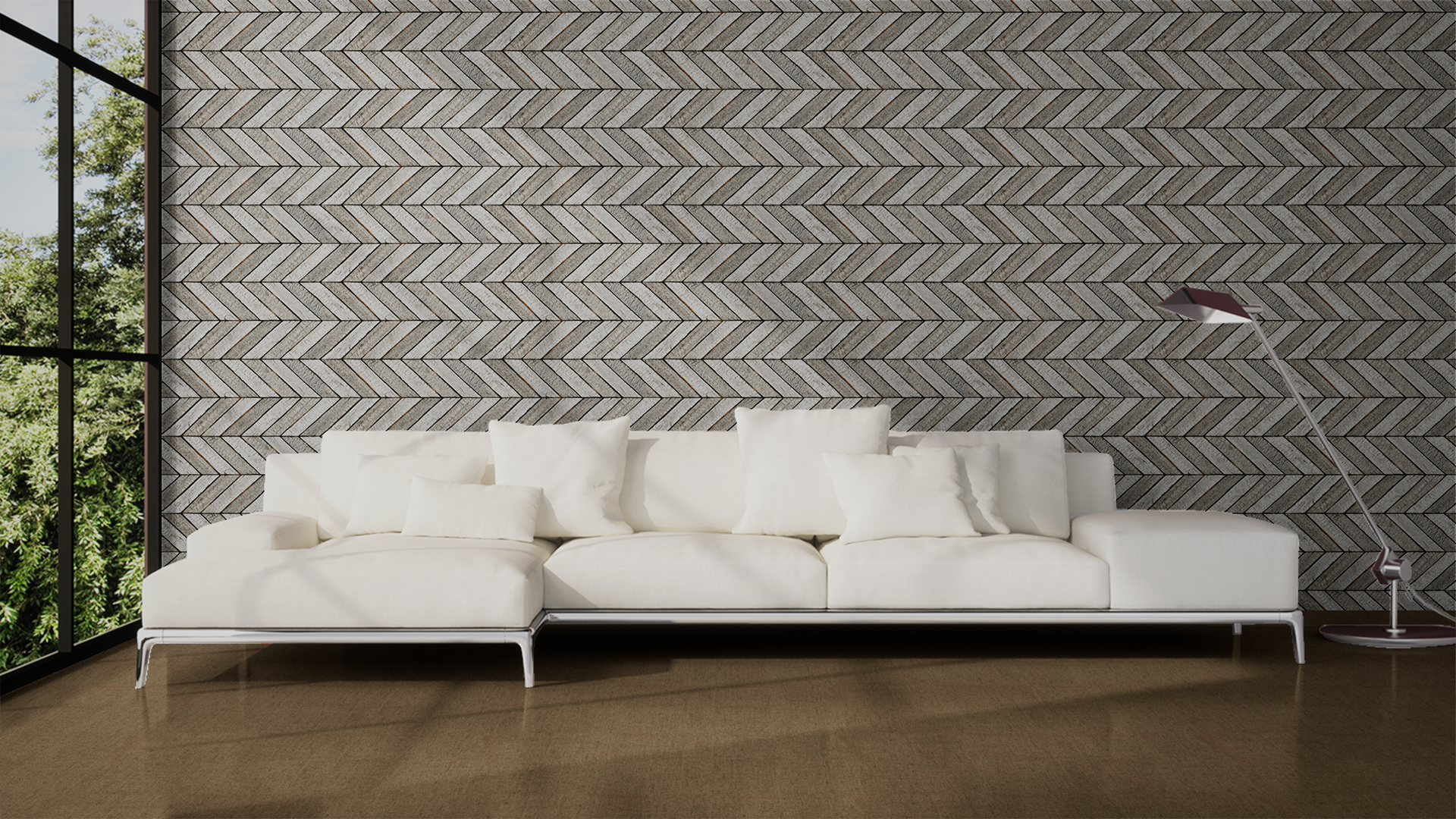 Sử dụng ánh sáng trắng hoặc vàng trung tính để tăng hiệu ứng 3D của họa tiết xương cá.