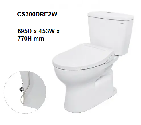 Kích thước: 695D x 453W x 770H mm Màu sắc: Trắng Hệ thống xả: Xi phông Lượng nước sử dụng: 4,8L/3L Hình dạng bồn cầu: Dài, Nửa chân bồn Đường kính bồn cầu: 305 mm Áp suất nước: 0,05 ~ 0,70 MPa Lưu ý: Có van chặn